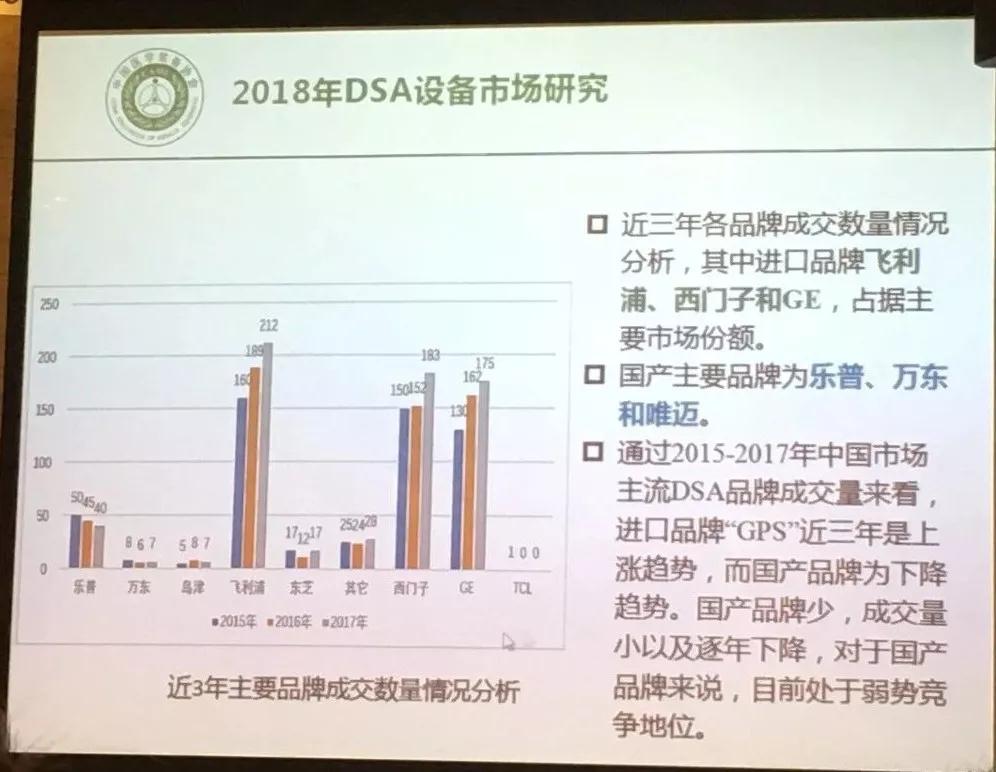 根據(jù)近3年主要品牌成交數(shù)量情況分析,目前國(guó)內(nèi)DSA市場(chǎng)主要為飛利浦、西門(mén)子和GE掌控,“GPS”三家的成交量呈逐年上漲趨勢(shì)。國(guó)產(chǎn)DSA廠家目前有主要包括樂(lè)普、萬(wàn)東和唯邁,基本處于弱勢(shì),成交量少,并且年銷(xiāo)售量呈下降趨勢(shì)。