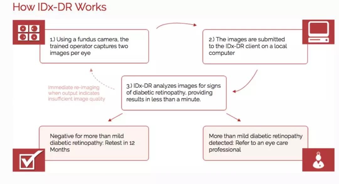 與預(yù)約真人醫(yī)生相比,IDx-DR 真的是太方便簡(jiǎn)單了,只需要護(hù)士或者醫(yī)生通過使用特殊的視網(wǎng)膜照相機(jī)拍下患者的視網(wǎng)膜照片,隨后按照 IDx-DR 軟件的指示上傳圖像,并確定圖像的質(zhì)量是否足夠獲得分析結(jié)果。如果圖像合格,軟件將自動(dòng)分析(無須專業(yè)醫(yī)生參與)患者是否患有糖尿病性視網(wǎng)膜病變,并將根據(jù)結(jié)果診斷并決策后續(xù)治療。