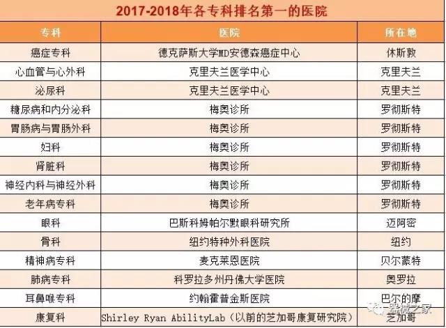 在醫(yī)療界梅奧診所就是傳說中的麥加,世界頂尖的醫(yī)療機(jī)構(gòu)。2017年8月8日,《美國新聞與世界報(bào)道》公布了2017-2018美國最佳醫(yī)院排行榜,梅奧診所以415分的總分再次榮登榜首,并在糖尿病和內(nèi)分泌專科、胃腸科、婦科、腎臟科、神經(jīng)??坪屠夏瓴W(xué)六個(gè)??浦信琶谝?。